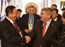 中国自行车运动协会主席崔大林向国际奥委会主席巴赫介绍 必赢瑞豹自行车